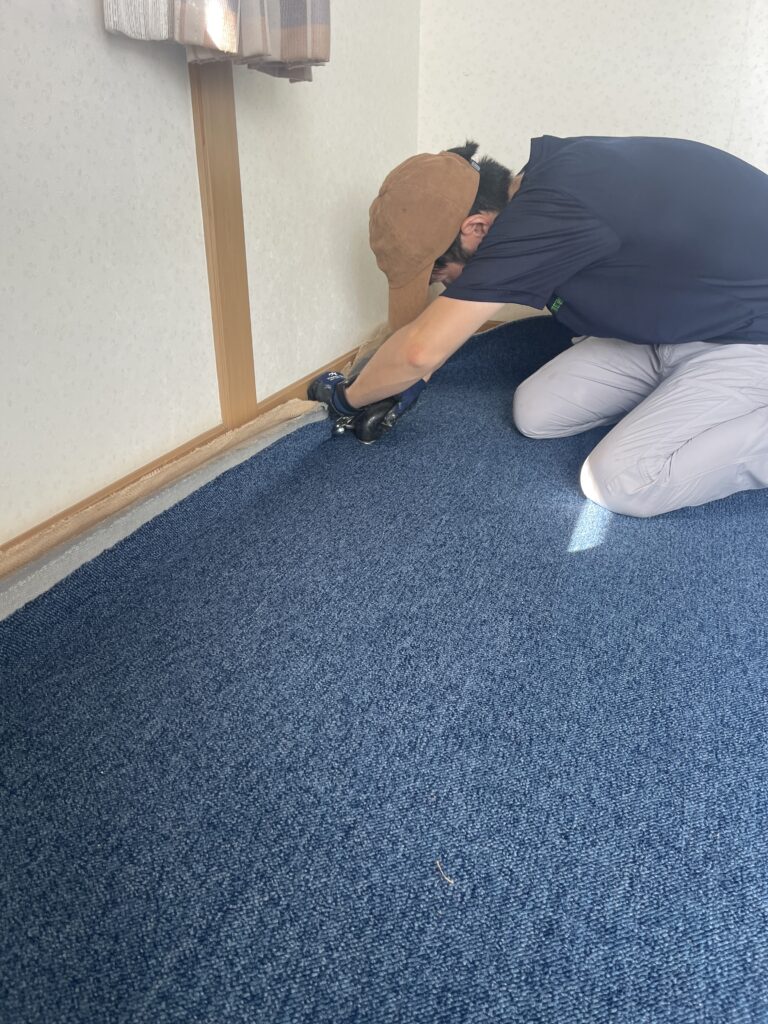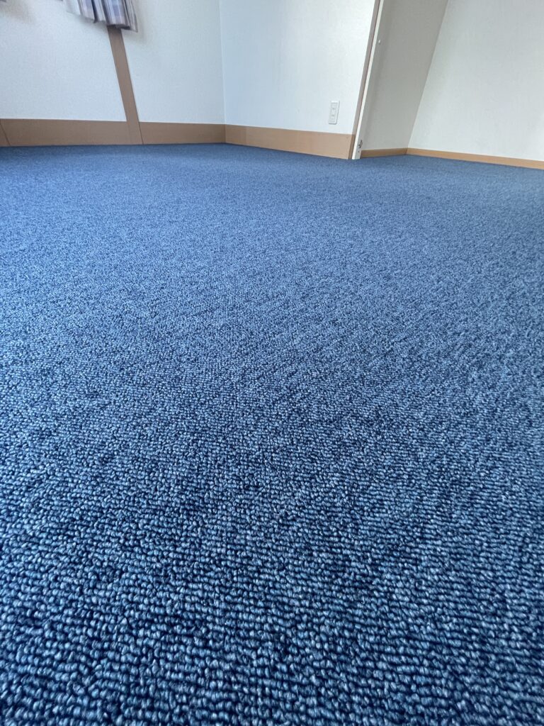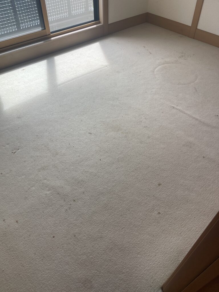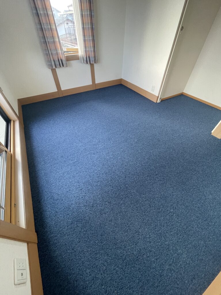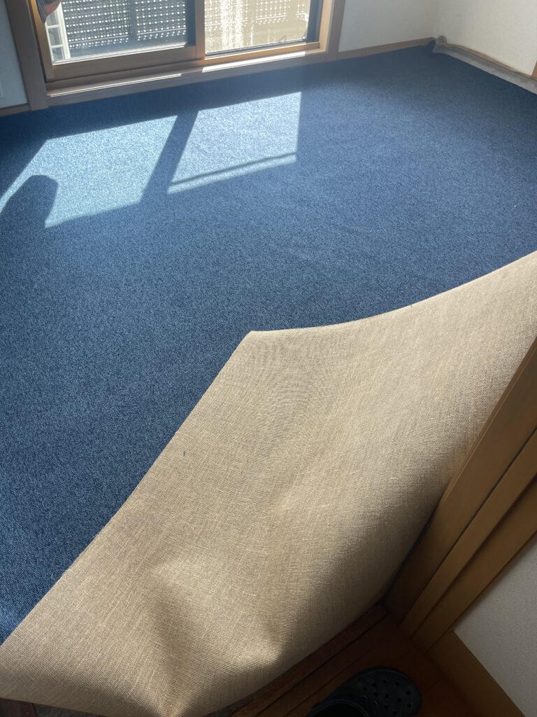 既存のカーペットはグリッパー工法でフローリングにするとコストがかかるので、防汚・撥水・防ダニ加工のカーペットを提案しました。