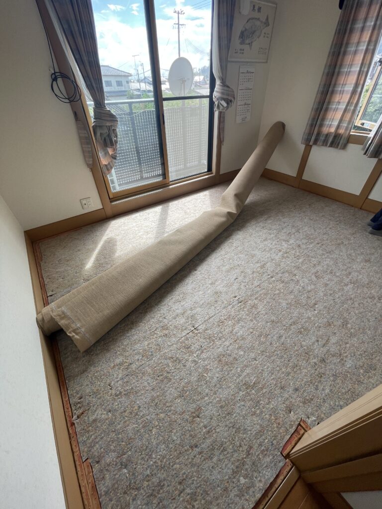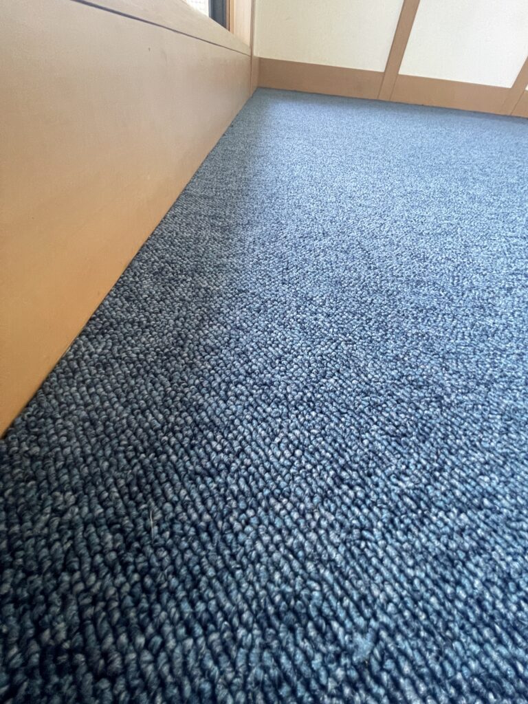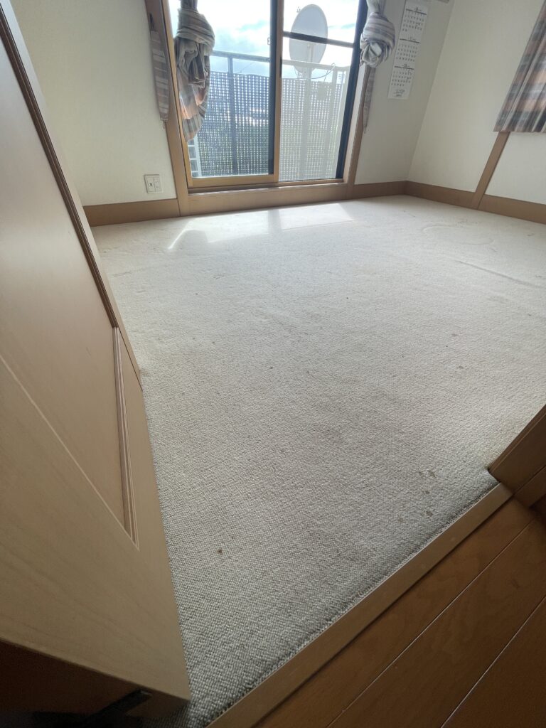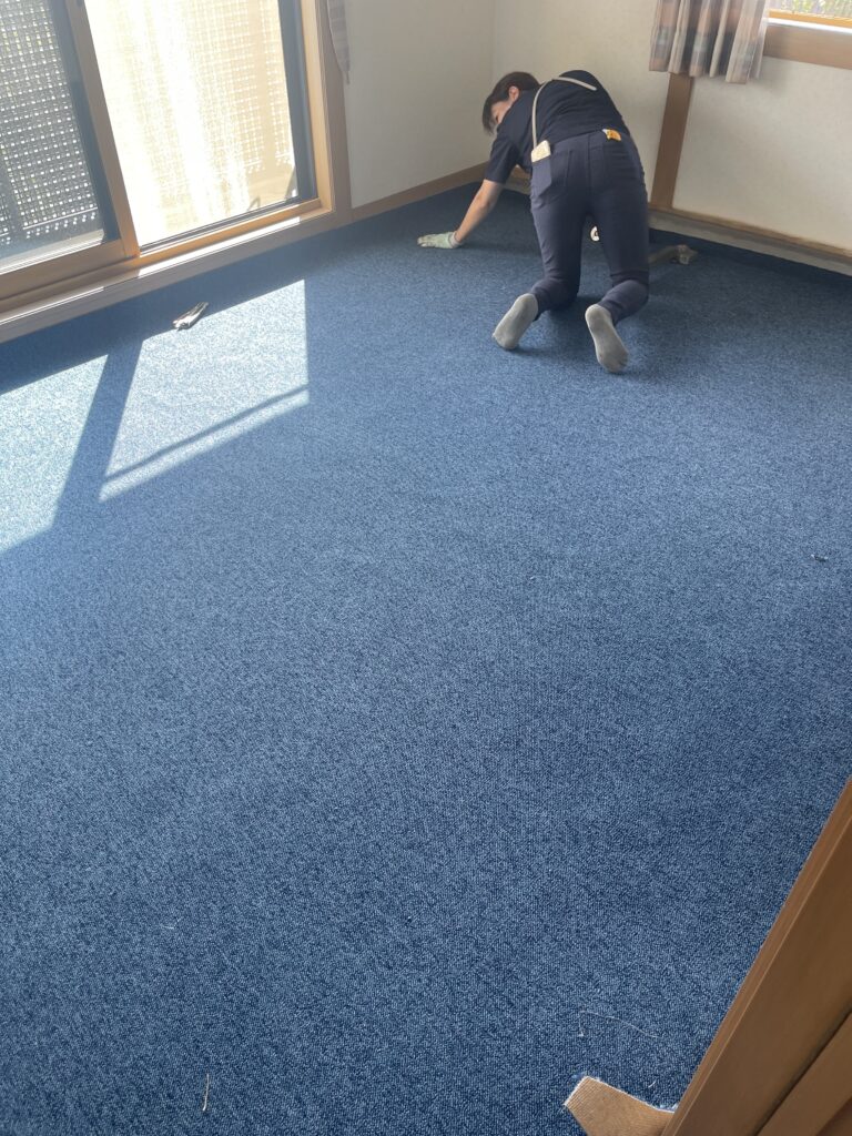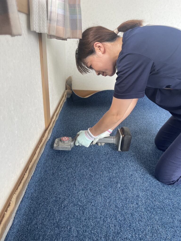 既存のカーペットはグリッパー工法でフローリングにするとコストがかかるので、防汚・撥水・防ダニ加工のカーペットを提案しました。